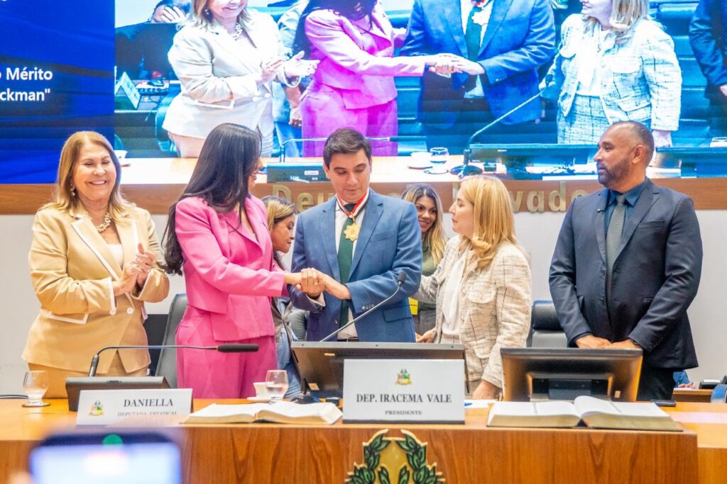 Cauê Ávila Aragão recebe os cumprimento das deputadas Daniella e Iracema Vale, ao lado de Roberto Costa e outras autoridades, durante entrega da Medalha ao gestor